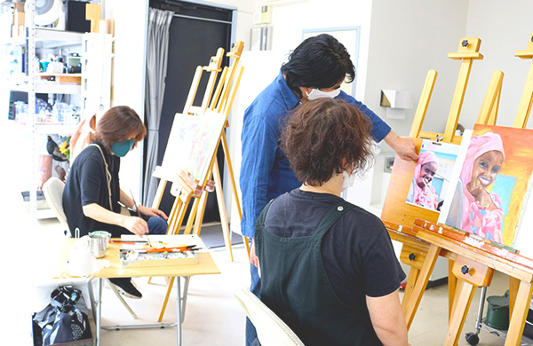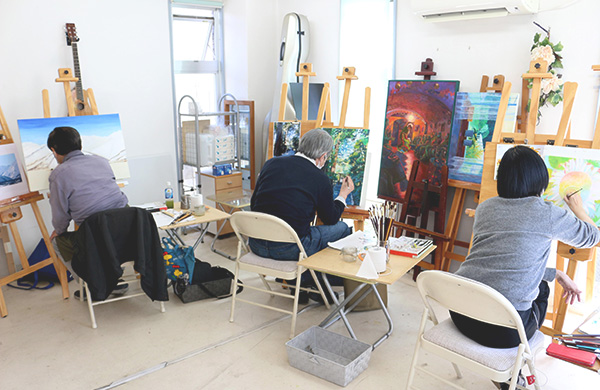 モチーフはアトリエにあるものの他、描きたいものをご自分のペースで楽しみながら描きましょう。絵の具や道具を保管するボックスをご用意しております。制作中の作品はアトリエで保管できます。(※保管料は無料です)